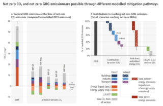 All modelled pathways for achieving 1.5°C and 2.0°C targets have global CO2 emissions peaking before 2025, and to be reasonably confident of achieving the goals, overall GHG emissions must also peak before 2025. (In fact, this applies even for 2.5°C.) Global net zero CO2 emissions are reached in the early 2050s for 1.5°C pathways (with a degree of confidence above 50%) with no or limited overshoot, and around the early 2070s for 2.0°C (confidence level of above 67%). “Deep GHG emissions reductions by 2030 and 2040, particularly reductions of methane emissions, lower peak warming, reduce the likelihood of overshooting warming limits and lead to less reliance on net negative CO2 emissions that reverse warming in the latter half of the century. Reaching and sustaining global net zero GHG emissions results in a gradual decline in warming.”