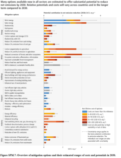 An excellent summary of potential means to reduce GHGs across all sectors is also given in the report, and is reproduced below. It gives a sense of both the scale and cost of the various mitigation options, and it is clear there is low-hanging fruit, options that achieve reductions at costs lower than ‘reference’, including wind and solar deployment, reducing methane emissions from oil and gas, avoiding demand for energy and implementing various energy efficiency measures, shifting to public transport and bikes, optimizing shipping, reducing the use of fluorinated gases, and capturing biogas from solid waste. Agriculture, forestry and land use changes offer a high degree of potential reductions, though at a lower cost than energy changes; industrial reductions and buildings reductions are also considerable, as is transport.