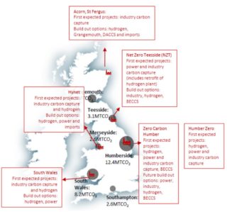 - CO2 capture and/or hydrogen production projects in Scotland, the North-West region, Teesside and Humberside (two projects) in England, and in South Wales.