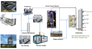 New ‘flagship’ pilot plant equipment to support the CO2 utilisation and SAF production activities will include the integration of an impressive range of equipment in a configuration linking a reverse water gas shift (RWGS) reactor, a Fischer-Tropsch (F-T) synthesis reactor and a fractionation column to produce SAF and ‘green transport fuel’ (GTF), with the CO2 supplied from the upgraded and relocated 1 tonne/day post combustion capture plant from PACT and H2 from a new electrolyser (powered by renewable electricity from a solar PV array to be located on the roof of TERC/PACT2) and a new biomass gasifier (see diagram).
