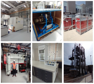 Photos show: the Test Hall with installation of alkaline electrolyser, SAF- and hydrogen-fired aviation ASUs, and electrical energy storage facilities being installed; pipework and manifold installation in the Outside Compound to handle a wide range of flue gases and synthetic gases; the alkaline electrolyser and PEM fuel cell installations; an ASU still to be unpacked; banks of 5bar hydrogen cylinders that will constitute the hydrogen storage facility; a moving-grate biomass boiler in a dedicated boiler house in the Outside Compound; part of the ‘wet’ laboratory within the TERC building; and the 1tpd CO2 capture rig installed in the Outside Compound, soon to be joined by a rotating packed bed capture rig on an adjacent pad.