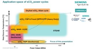 Indeed, Siemens Energy has been working in Europe on sCO2 for the last few years with a range of potential applications in mind.  They have done much of  the preparatory work as part of the Carbsola research project with €2.2m of funding from the German Ministry of Economic Affairs and Energy.  Together with Dresden University of Technology, the Helmholtz Centre in Dresden and the German Aerospace Centre in Cologne, they have been working to show that the technology for sizeable volumes of waste heat is commercially mature.  In addition to using the waste heat from gas turbine combined cycle power plants (CCPP), the research partners are testing its use in concentrated solar power (CSP) plants and Siemens have also shown the potential application of the technology for waste-heat recovery in geothermal applications (so-called Next Generation Geothermal Power – NGP), as shown in the figure below.