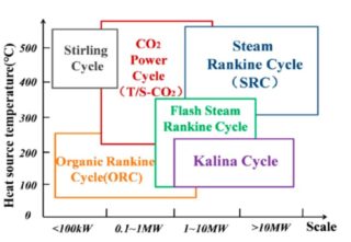 Work by other researchers such as Liuchen Liu and colleagues at the University of Shanghai for Science and Technology, Shanghai, China (see paper Liu et al, 2020) shows that sCO2-based cycles are particularly suited to waste heat recovery applications, both in terms of the heat source temperature and typical power output size, as can be seen in the diagram below.