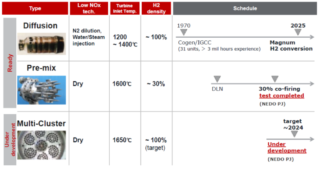 By way of background, a feasibility study for the H2M project has been successfully completed. A key component of the study was conversion of the plants M701F gas turbine supplied by Mitsubishi Power to burn 100% hydrogen by 2025. The combustion system options for this include relatively conventional diffusion flame combustion with NOx control achieved using nitrogen/steam/water diluent injection, or a concept under development utilising a ‘multi-cluster’ combustor, with the development paths shown below. The expectation is that to meet the H2M project timescale, the diffusion approach with diluent injection will be adopted.
