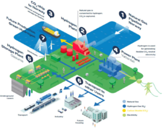 Swedish power company Vattenfall has reported that it will investigate the sale of its 1.32 GW Magnum natural gas fired combined cycle gas turbine (CCGT) power plant. The power plant was originally designed as a coal gasification installation, but eventually built as a gas-fired power station with three steam and gas turbines. The ‘H2M’ (Hydrogen to Magnum) project there is a collaboration between Nuon, Equinor and Gasunie to convert one of the three 440 MW CCGT units of the Magnum power plant, located in Eemshaven, near Groningen in the Netherlands, to hydrogen. Equinor will provide an autothermal reformer (ATR) plant, where hydrogen will be produced from natural gas that is imported from Norway, with the carbon dioxide being captured. The H2M concept, as shown below, is to integrate a salt cavern to enable system flexibility, with the captured CO₂ shipped back to Norway and stored offshore.