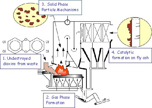 Various mechanisms have been proposed for the dioxins emissions from incinerators. Figure 1 shows four possible formation paths identified: